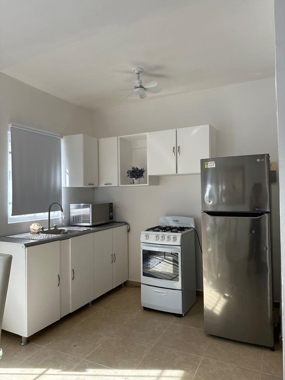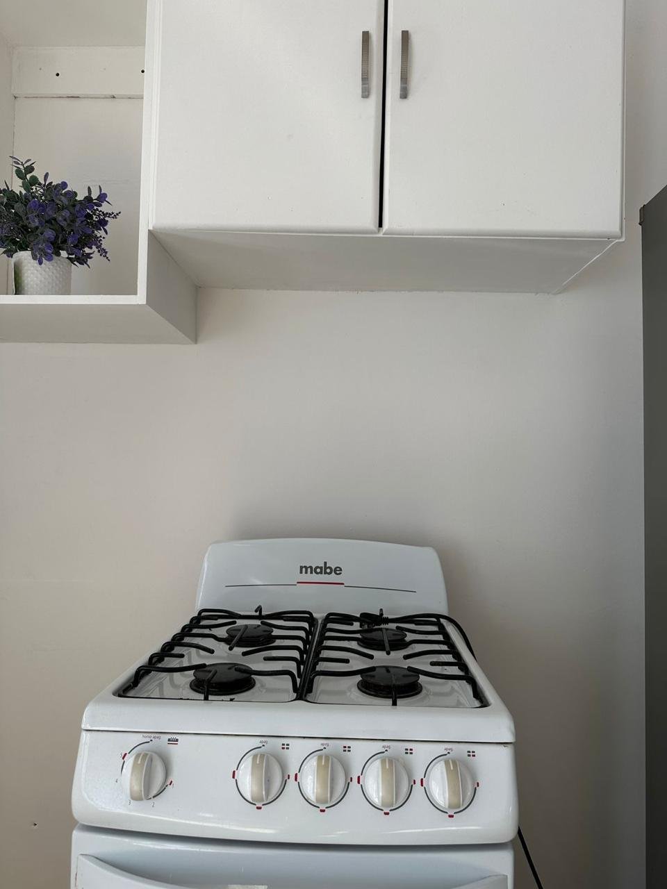 Cocina equipada recién remodelada con, microondas y estufa de 4 quemadores que incluye horno.