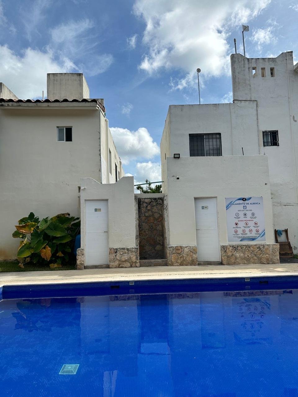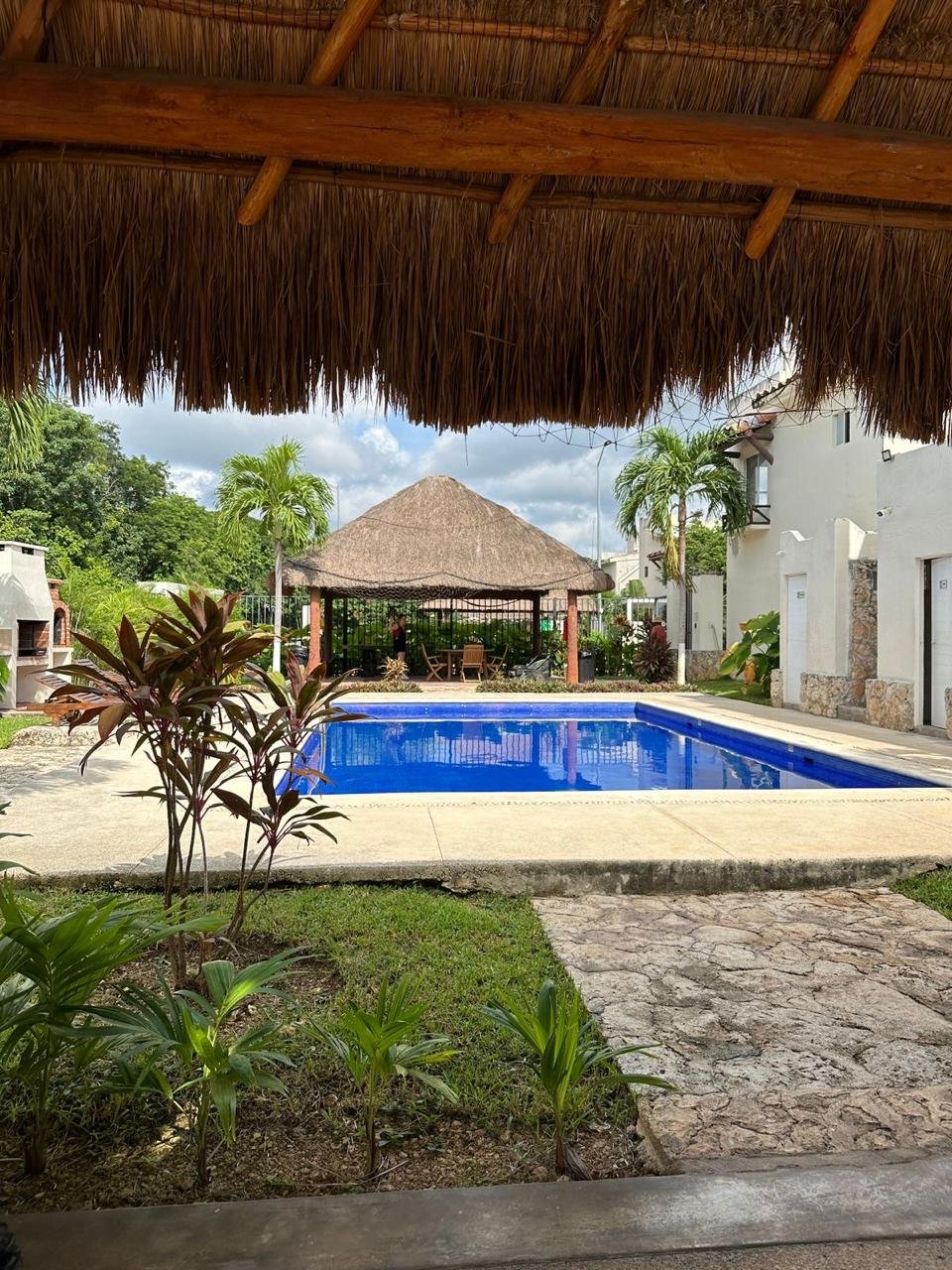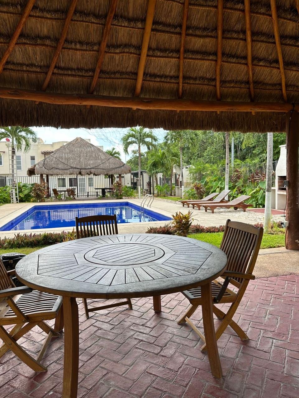 Alberca con palapa, mesas, sillas, asador, camastros.