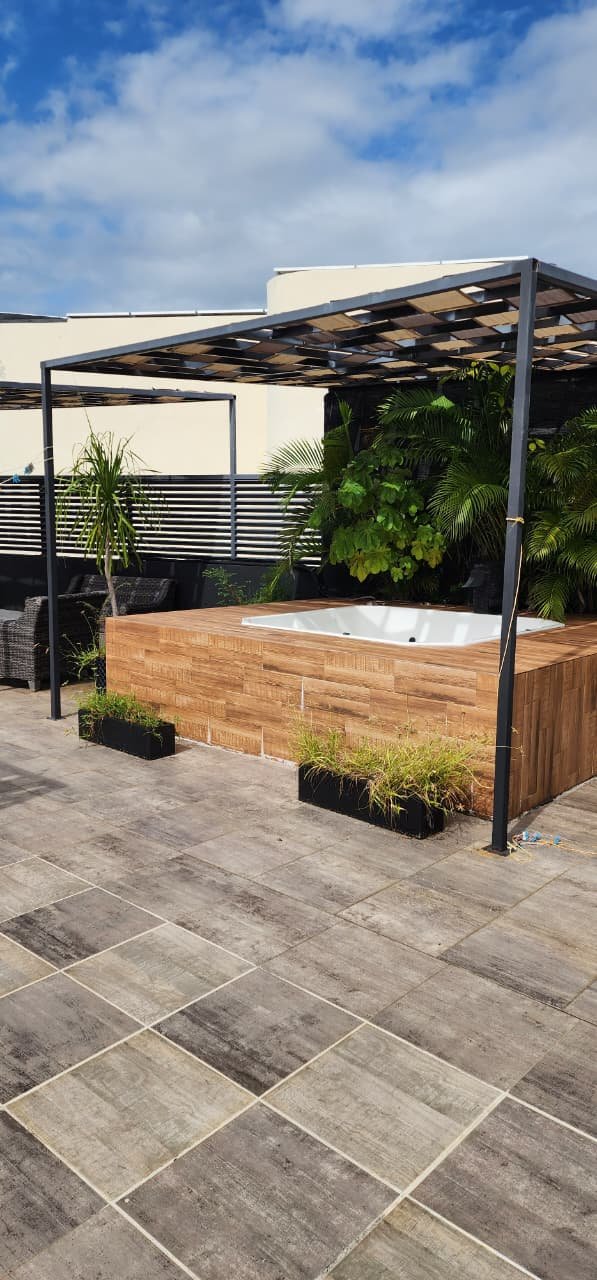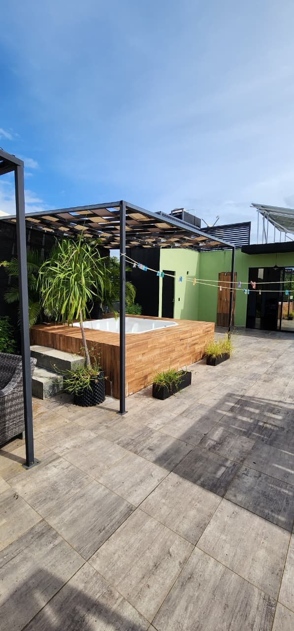 Rooftop equipado con jacuzzi y asador, perfecto para reuniones y atardeceres inolvidables.